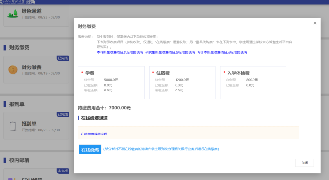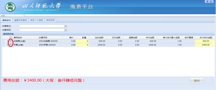 进入缴费平台系统缴费界面(图2-1 )。勾选费用名称后,检查左下角的“费用总额”无误后,点击右下角