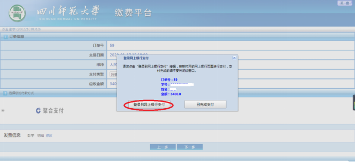 ,系统显示相关缴费信息(图2-4),确认无误后点击“登录到网上银行支付”。