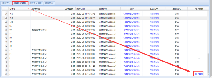 票据查询:点击需查询订单号右侧“电子票据”按钮,可查询此订单号成功缴费的电子票据(图3-2)。